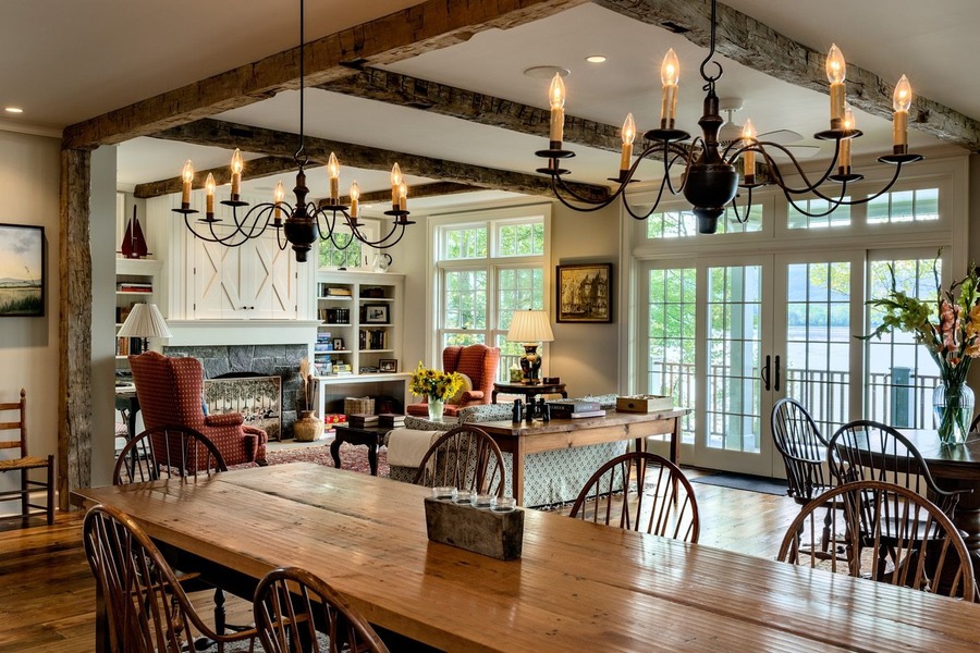 Американский тип оформления жилья на фермах и ранчо в светильниках выражается в широком использовании дерева, металла, прозрачного стекла и тканевых абажурах с геометрическим орнаментом.