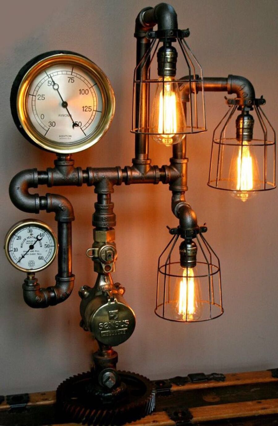 Светильник отличает брутальность конструкции, напоминающей об эре паровых машин и механизмов.