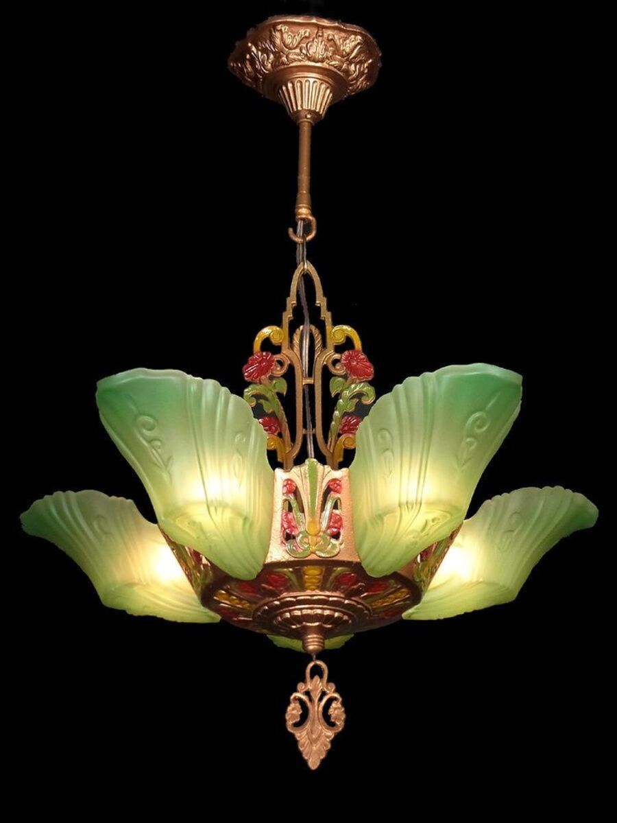 Таковыми в стилистике прошлого столетия выступают люстры и одиночные подвесы. Материалами изготовления служат металл, стекло, дерево.