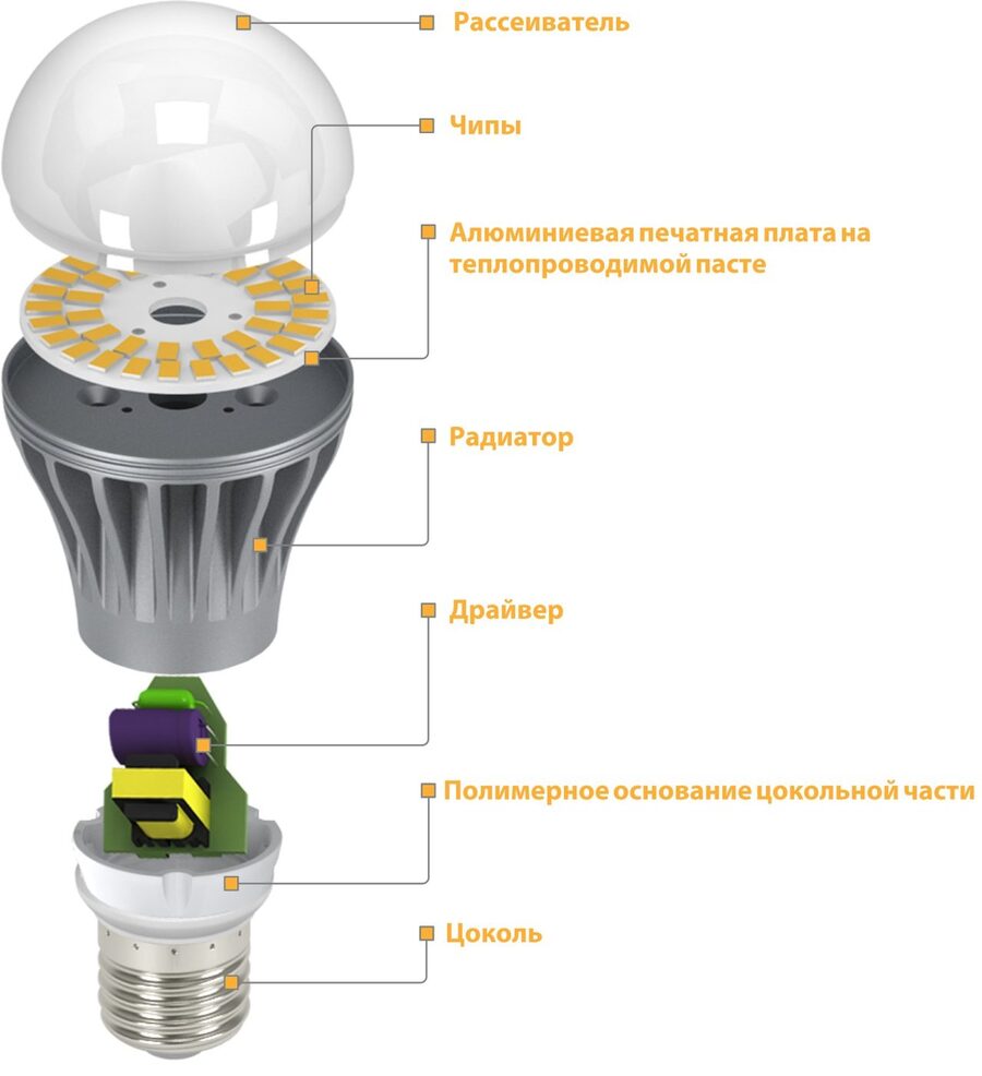 Отличием обычных ламп от диммируемых является наличие у последних управляемого драйвера, который расположен внутри конструкции. Этот элемент отвечает за плавное изменение светового потока.