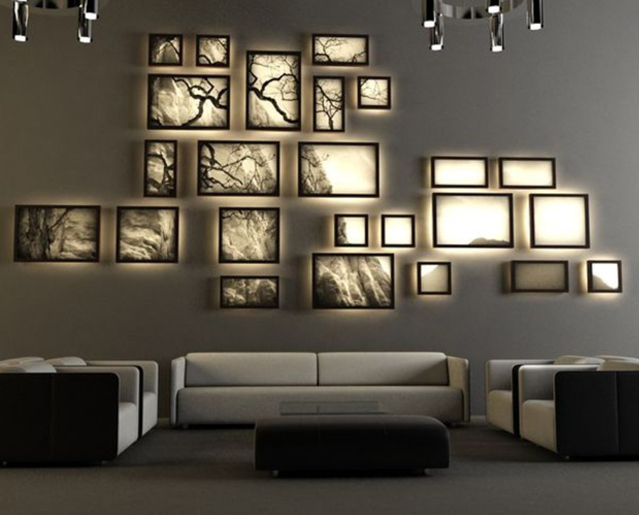 Важным нюансом является выбор правильного уровня подсветки, который всегда должен быть светлее, чем основное освещение в комнате. Таким образом, свет привлечен внимание к произведению и подчеркнет его место в интерьере.