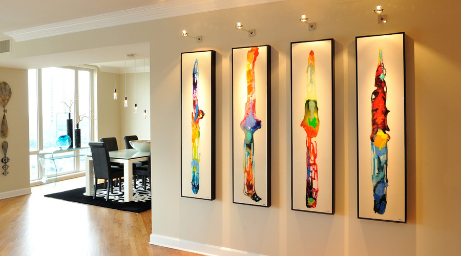 В домашних условиях источником освещения картины могут служить точечные светильники, установленные вдоль стены с полотнами.