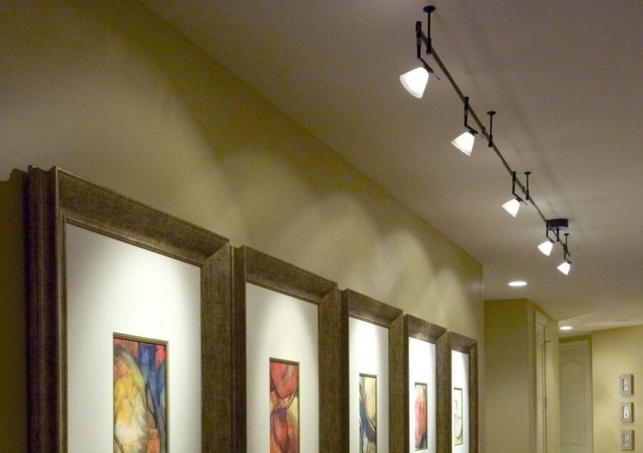 При подсветке нескольких работ удобнее использовать трековые шины с расположенными на ней софитами. Зачастую к такому варианту прибегают в галереях и общественных пространствах, где произведения меняются и всегда есть возможность настроить свет индивидуально для каждого случая.