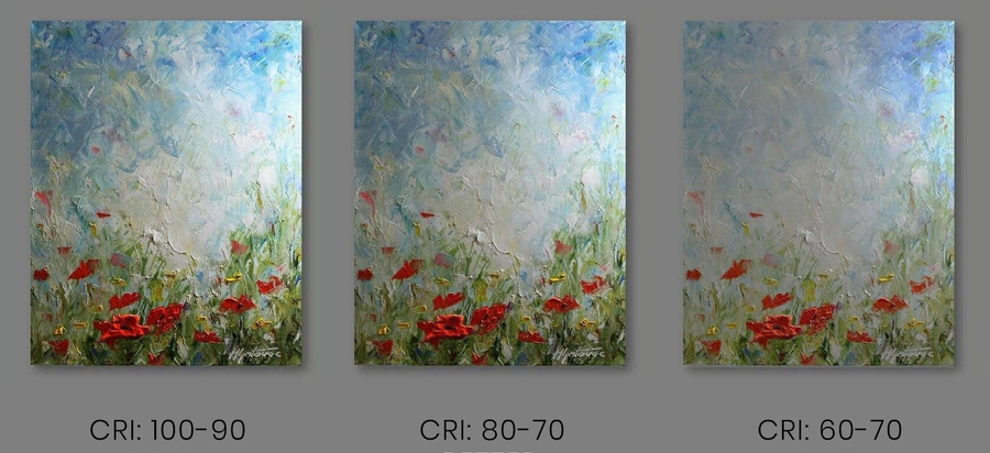 Показатель, отвечающий за восприятие органами зрения человека оттенков работ, имеет идеальный ориентир CRI 100. Такой свет исходит от солнца, он правильно отображает и не искажает цвета в пространстве. Не стоит выбирать для освещения художественных произведений лампочки с показателем CRI ниже 95.