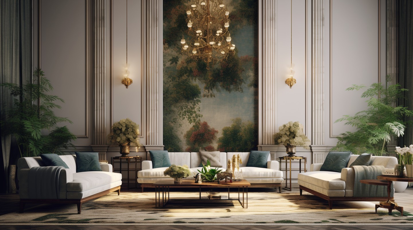• Стилизованные изображения. В Art Deco часто встречаются стилизованные изображения животных (павлины, пантеры, газели), растений (цветы, листья), солнца, фонтанов и женских фигур. Эти изображения добавляют интерьеру изысканности и чувственности.