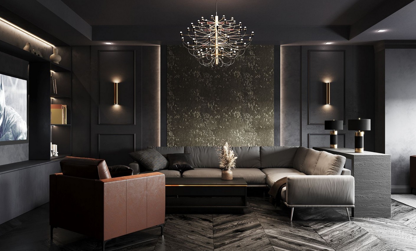 Как воплотить потрясающую атмосферу с помощью больших люстр, настенные бра и акцентных источников света. В гостиных можно повесить большую хрустальную люстру, установить торшеры с абажурами из шелка и разместить светильники Арт-Деко настенного типа с геометрическими узорами.