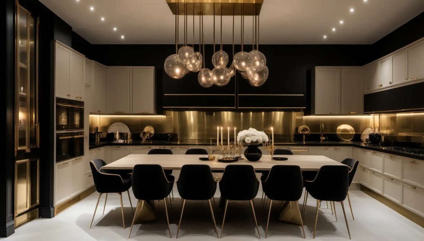 Как освещать кухню в стиле Арт-Деко, не перегружая пространство. На кухне можно использовать точечные модели для подсветки рабочей поверхности и повесить подвесные варианты над обеденным столом.
