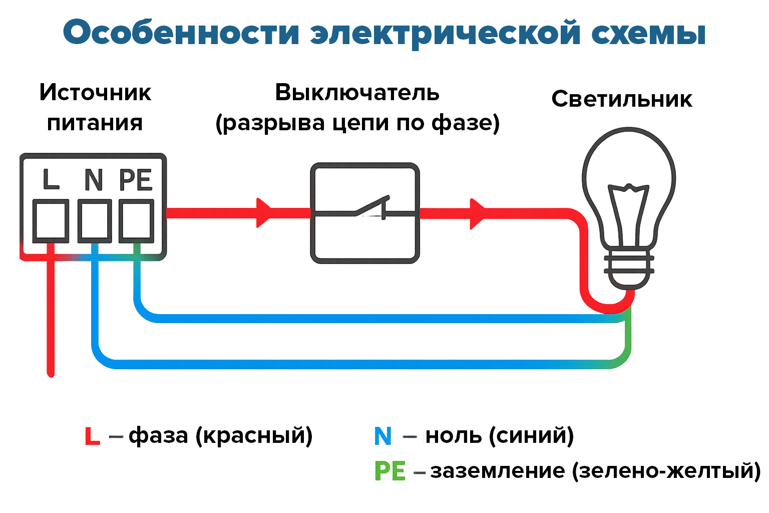 В любой электрической схеме подключения лампочки к выключателю участвуют три основных элемента: