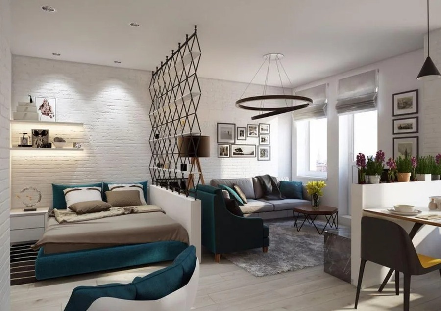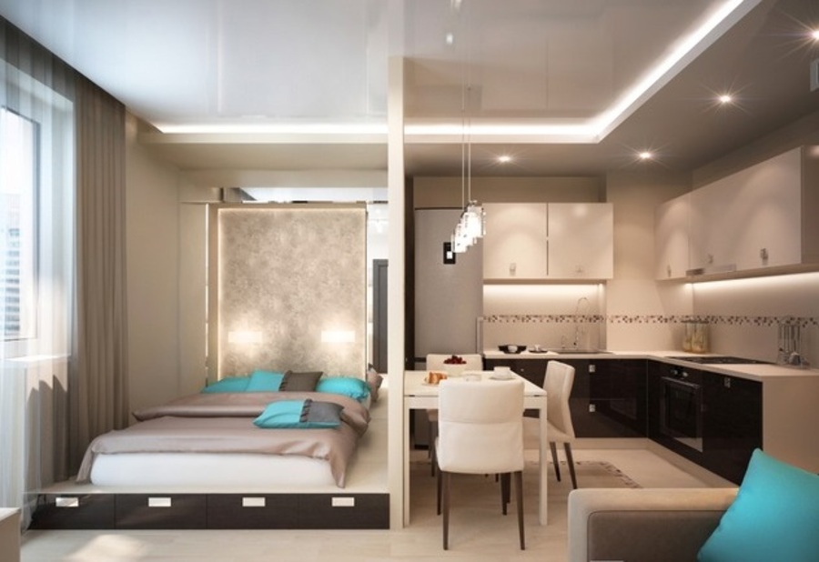 При наличии в квартире лишь одной комнаты стоит задача о совмещении трудносовместимых зон: спальни, гостиной, кухни.