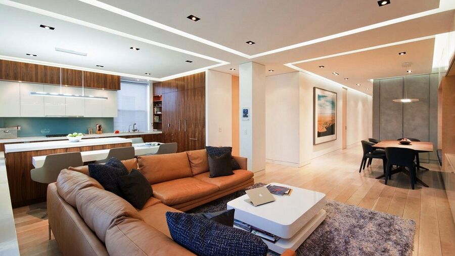 Если зона кухни выделена с помощью плана расстановки мебели, освещение организуется сочетанием различных типов приборов в каждой из областей: например, люстра в центре зоны отдыха и точечные светильники на кухне.