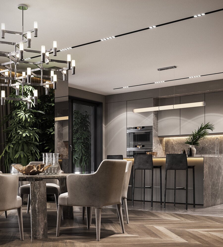 В зоне кухни отдельный трек с поворотными софитами удобен для освещения рабочей поверхности гарнитура и не слепит глаза при нахождении в другой части комнаты.