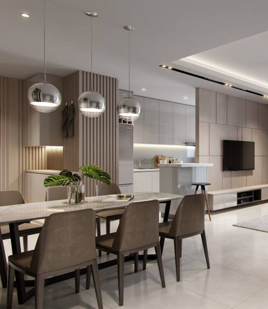 При ужине с близкими родственниками и друзьями достаточно использовать дополнительный потолочный прибор в виде спотов или трековых софитов. Подвесной светильник над обеденным столом придаст обстановке уюта и тепла.