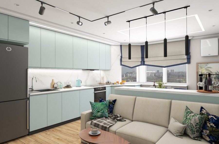 В небольшой кухне-гостиной можно использовать трековый свет по периметру комнаты.