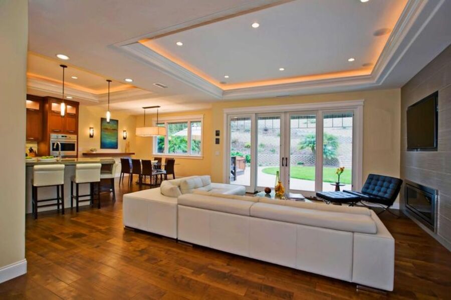 При наличии в комнате перепадов уровня потолка, скрытое свечение по границе позволит эффектно разделить общую площадь на несколько зон.