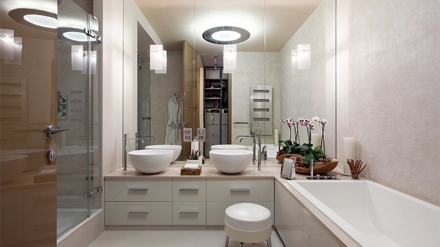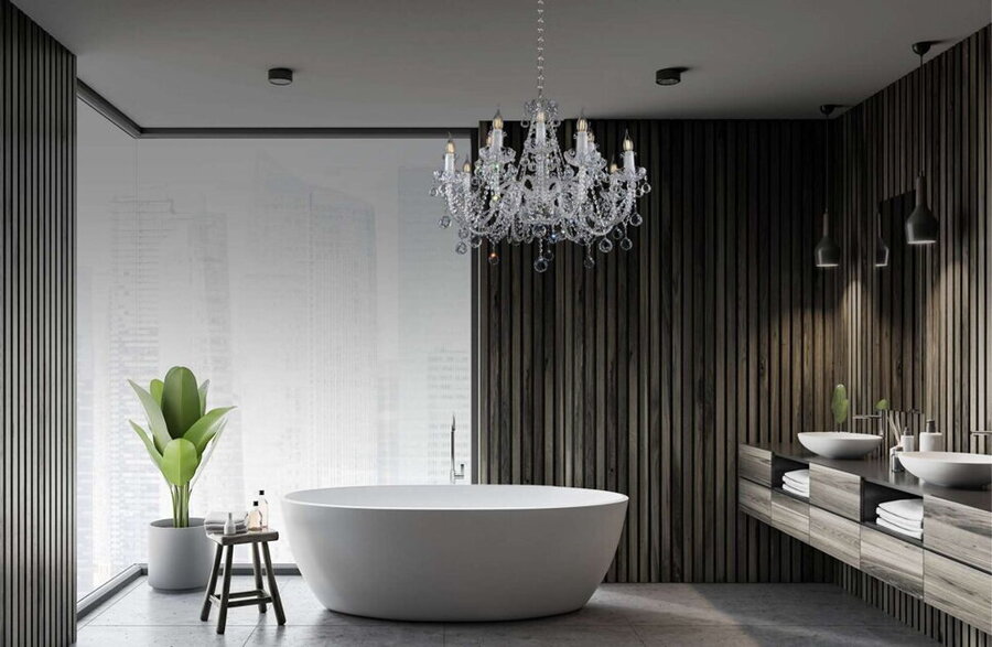 В роскошных сантехнических помещениях над ванной устанавливают люстру. В зоне умывальника можно использовать зеркало со светодиодной подсветкой или спущенные по бокам небольшие подвесы.