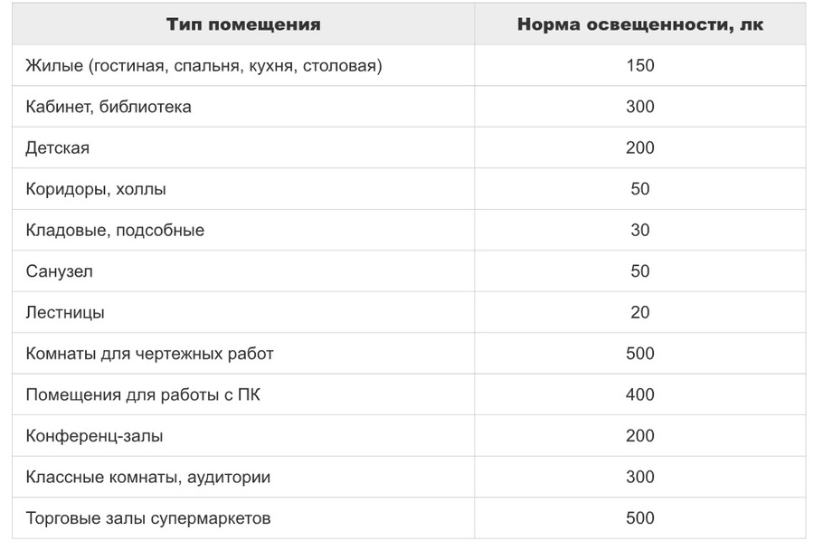 В зависимости от предназначения показатели освещения могут разниться.