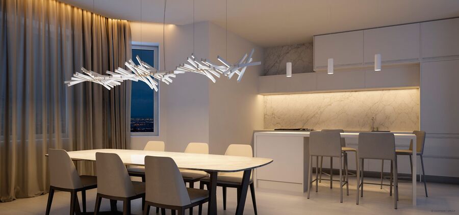 Вместо одного источника даже на небольшой кухне используйте встроенный свет над столешницей и отдельный абажур в обеденной зоне. Таким образом пространство визуально приобретает наполненный уютом объем.