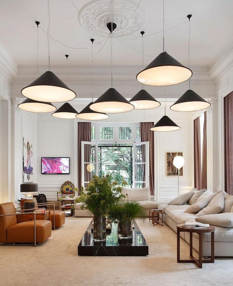 Подвесные модели устанавливают над обеденной зоной и журнальным столиком в лаундж-уголке.