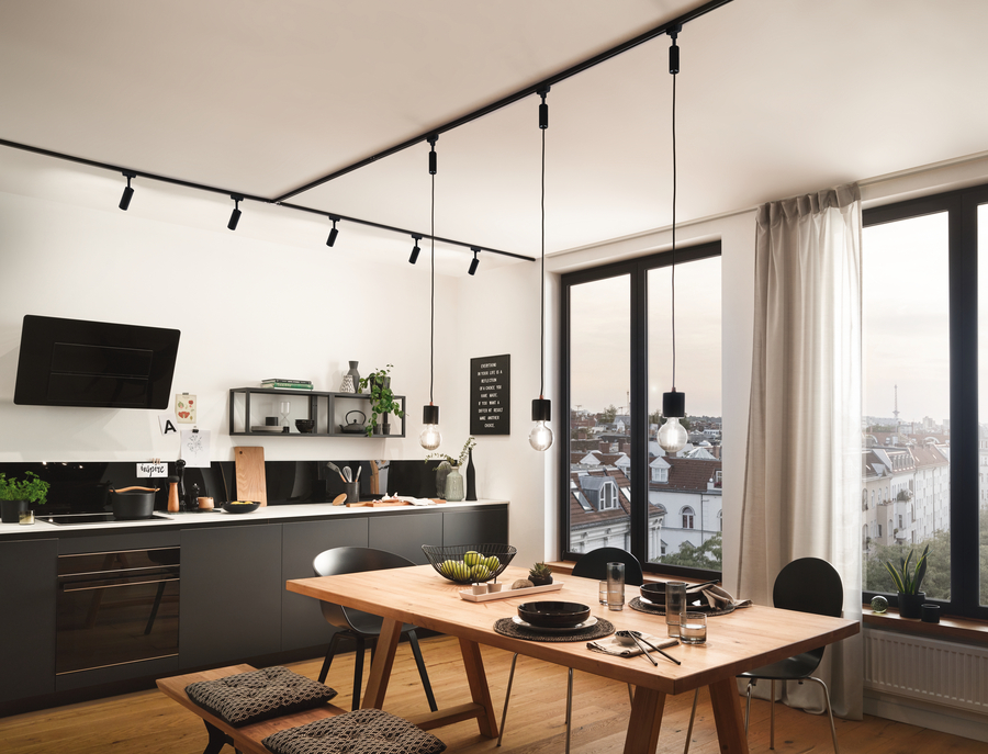Точечный или трековый свет располагают над рабочей зоной кухни, письменным столом и над диваном.