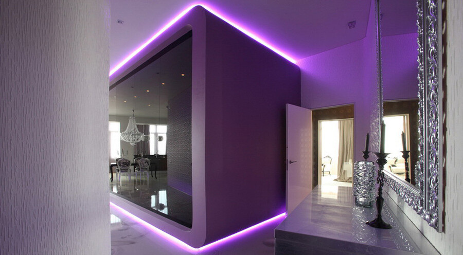 С помощью светодиодной подсветки можно создать различную атмосферу в пространстве, а также зрительно увеличить высоту потолков.