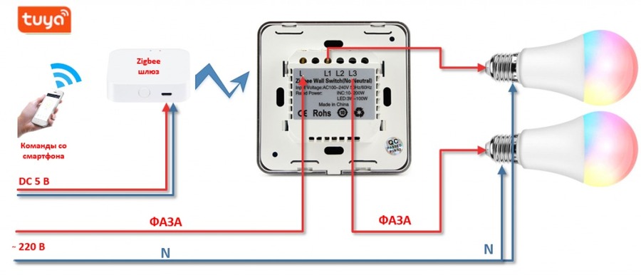 Реле соединяется с электропитанием и выключателем. После чего вся конструкция интегрируется в смарт-систему дома.