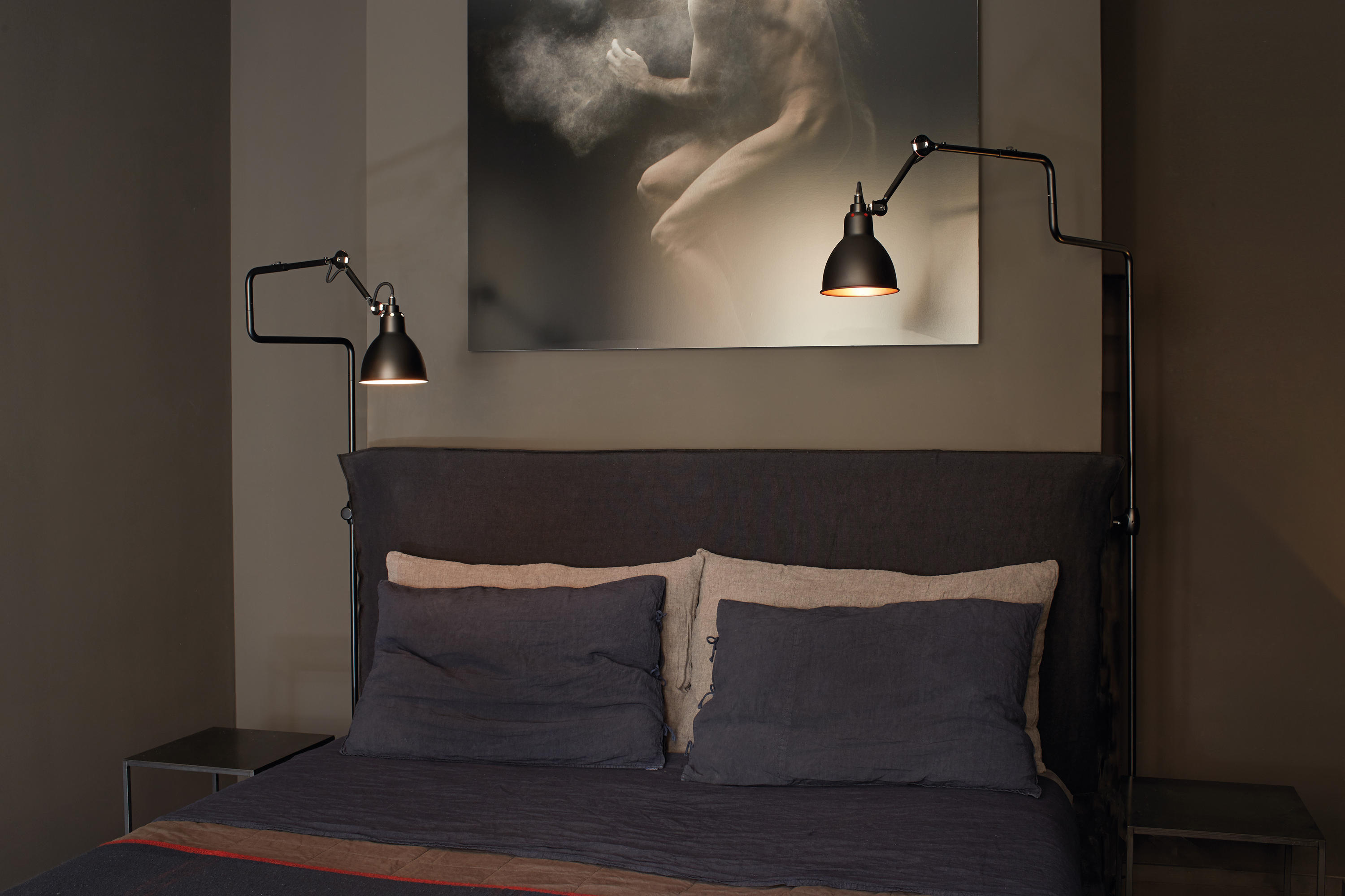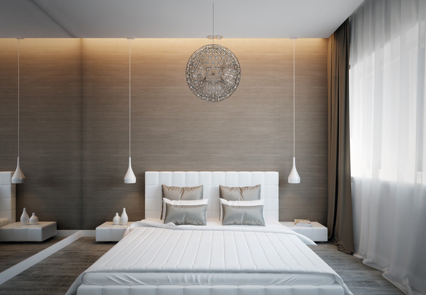 - Над прикроватными тумбами — 50–60 см от поверхности (для плафонов диаметром 30 см). Если светильник крупный (как Tom Dixon Melt), увеличьте расстояние до 70 см.
