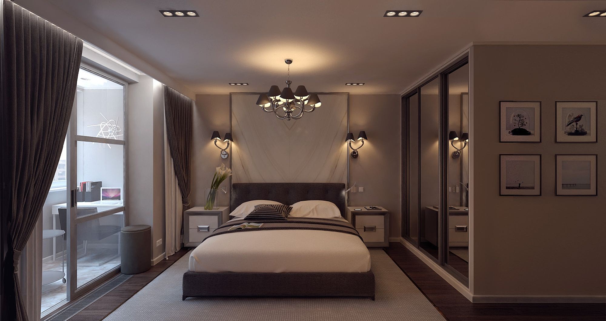 - Многоуровневое освещение помогает зонировать пространство: мягкий торшер для чтения, подсветка гардероба, приглушенный свет над кроватью.