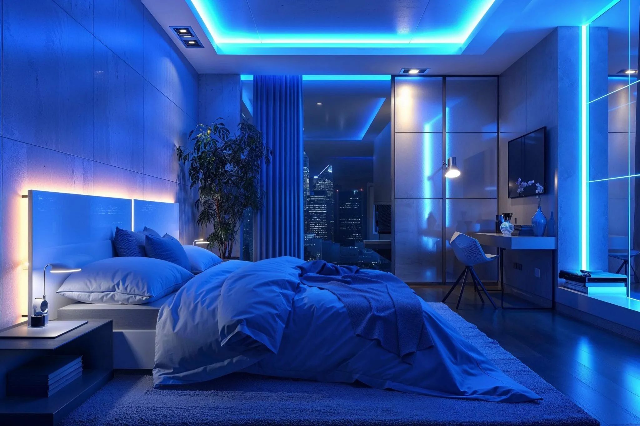 - Добавьте декоративную подсветку (световые полосы за изголовьем).