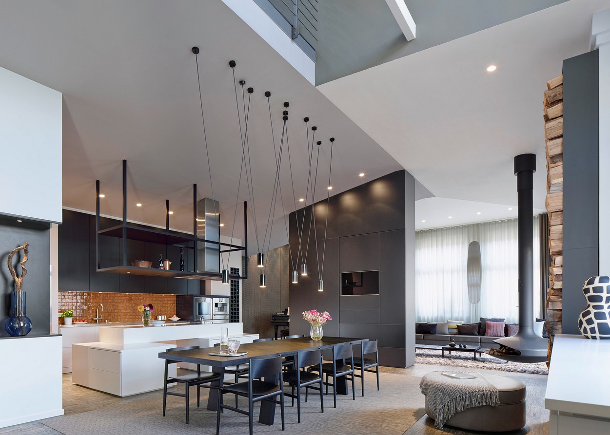 Подвесные светильники становятся стильным акцентом в интерьере с высокими потолками.