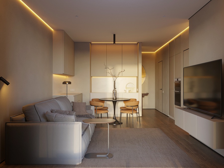 Такой вариант освещения в сочетании со светлой отделкой может создать ощущение стерильности, а следовательно отсутствие атмосферы уюта и тепла.
