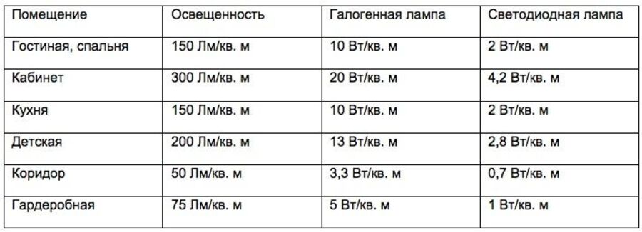 Рекомендуемая мощность ламп для различных помещений